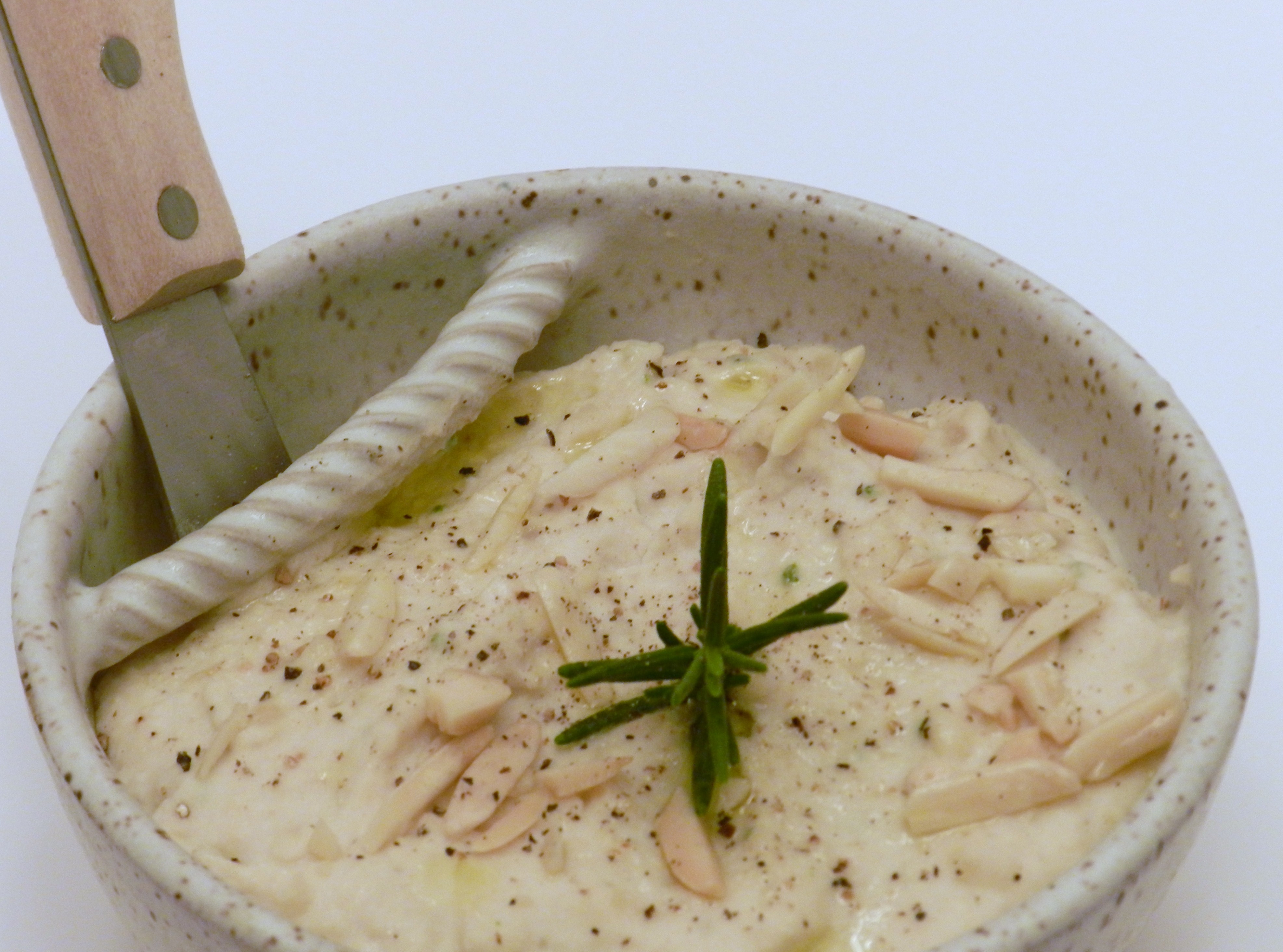 In a food processor, combine the beans, almonds, salt, pepper, lemon juice, lemon zest, and the rosemary garlic infused olive oil. Pulse until the ingredients come together. If it is too thick, add some hot water (start with a tablespoon). Pulse the mixture a few more time. Add a bit more water if needed. Taste and adjust the seasonings as needed (might need a bit more lemon juice, salt, or pepper). Process until the mixture is thick but still has some texture and is spreadable and dipable (I’m making up more words). If you want it more like traditional hummus, you can process it until it is a creamy purée. Keep in the refrigerator but serve at room temperature. Great on sandwiches or served with pita, crackers, or raw veggies!