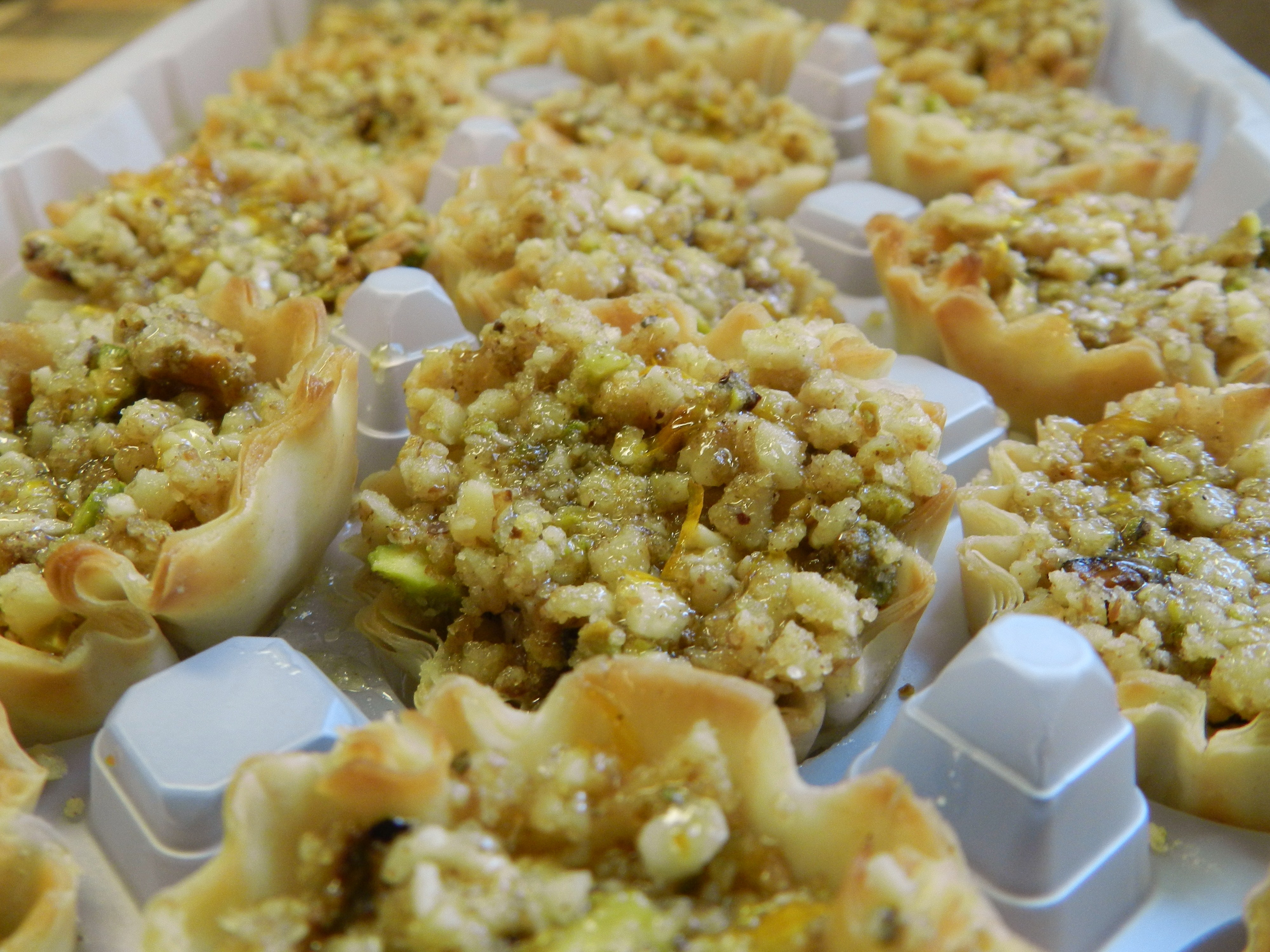 Probably the best place to look for rose flower water is in a Middle Eastern grocery, Mediterranean food market, Amazon.com, or a specialty food store. If you can’t find it, then orange blossom water could be substituted. Again, not the easiest ingredient to find. You can check the same stores. I think our local The Fresh Market (TFM) has orange blossom water. However, if you can’t find either ingredient, then vanilla will work. I found the mini fillo cups at Publix. It took three stores before I found them (Star Market and TFM did not have them). This recipe is really easy if you have a food processor: you make a honey simple syrup, make a nut filling, fill the shells, bake, and then chill. If you don’t have a food processor, it’ll just take a little more time to chop the nuts.