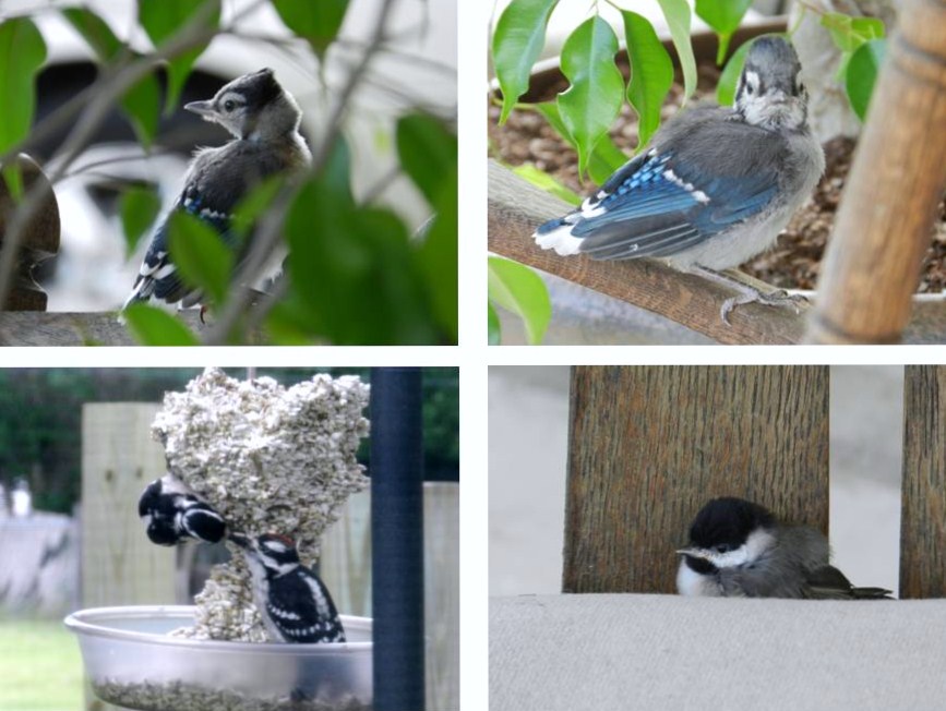 We are novice organic gardeners. We buy organic seeds and plants when we can and we don’t use pesticides. Instead, we use cayenne pepper, Dr. Bronner’s peppermint soap, garlic, and diatomaceous earth. We also plant marigolds, mint, onions, and nasturtiums for bug control. We still have more bugs than we’d care to have, but the birds don’t seem to mind. There are lots of baby birds at the Smith-Jordan house and we’re enjoying bird watching. This photo includes our blue jay, chickadee, and woodpecker babies. The baby titmouse and cardinal are too elusive to capture on film.
