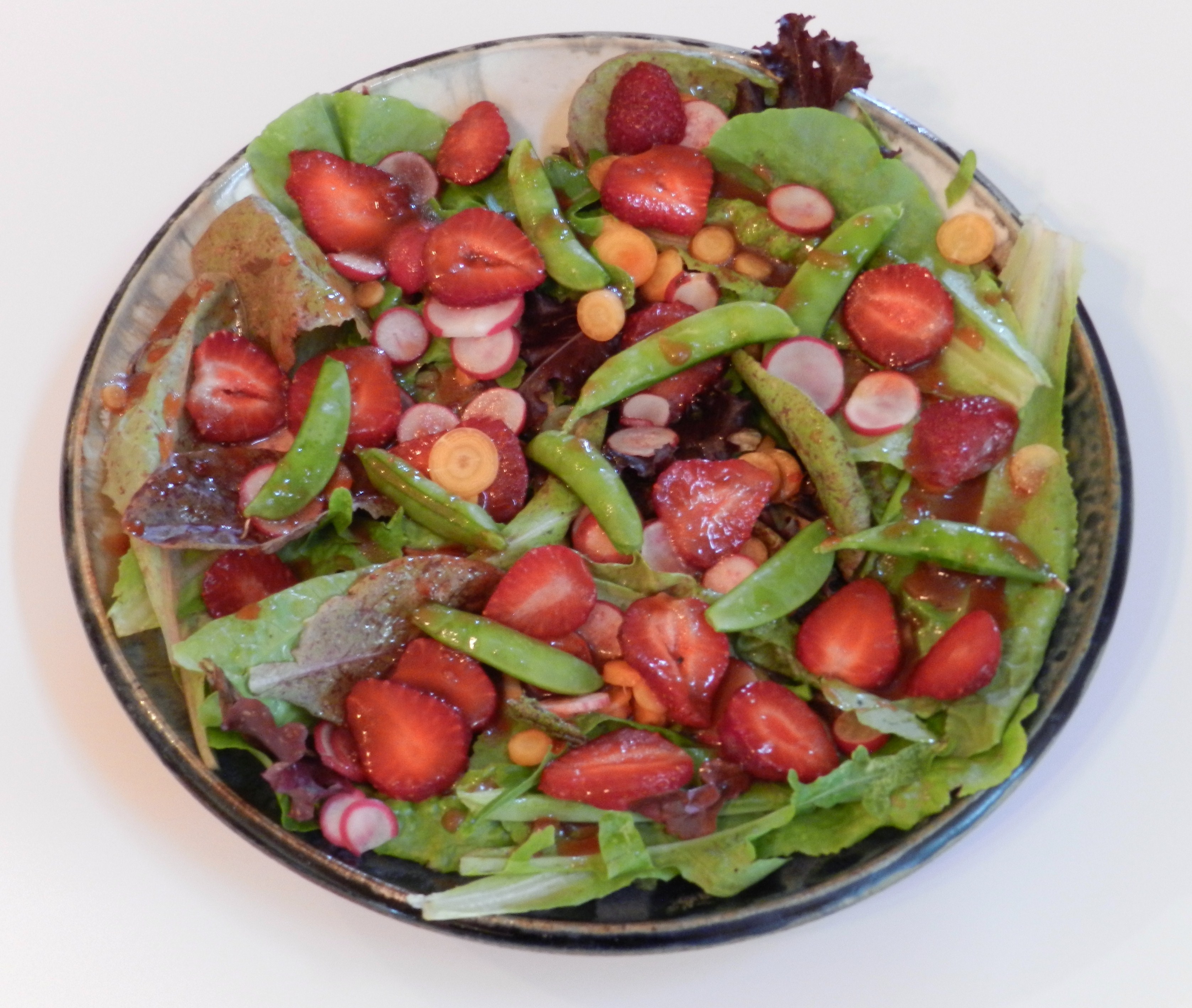 We are enjoying lots of fresh salads. This week, we went to a birthday party for a friend. We brought a spring salad with a strawberry habanero balsamic vinaigrette. It was tasty with an interesting combination of flavors – sweet, bitter, and spicy. We picked the carrots, radishes, peas, and greens from our garden and bought the strawberries at the Madison Farmer’s Market. It doesn’t get much fresher than that!