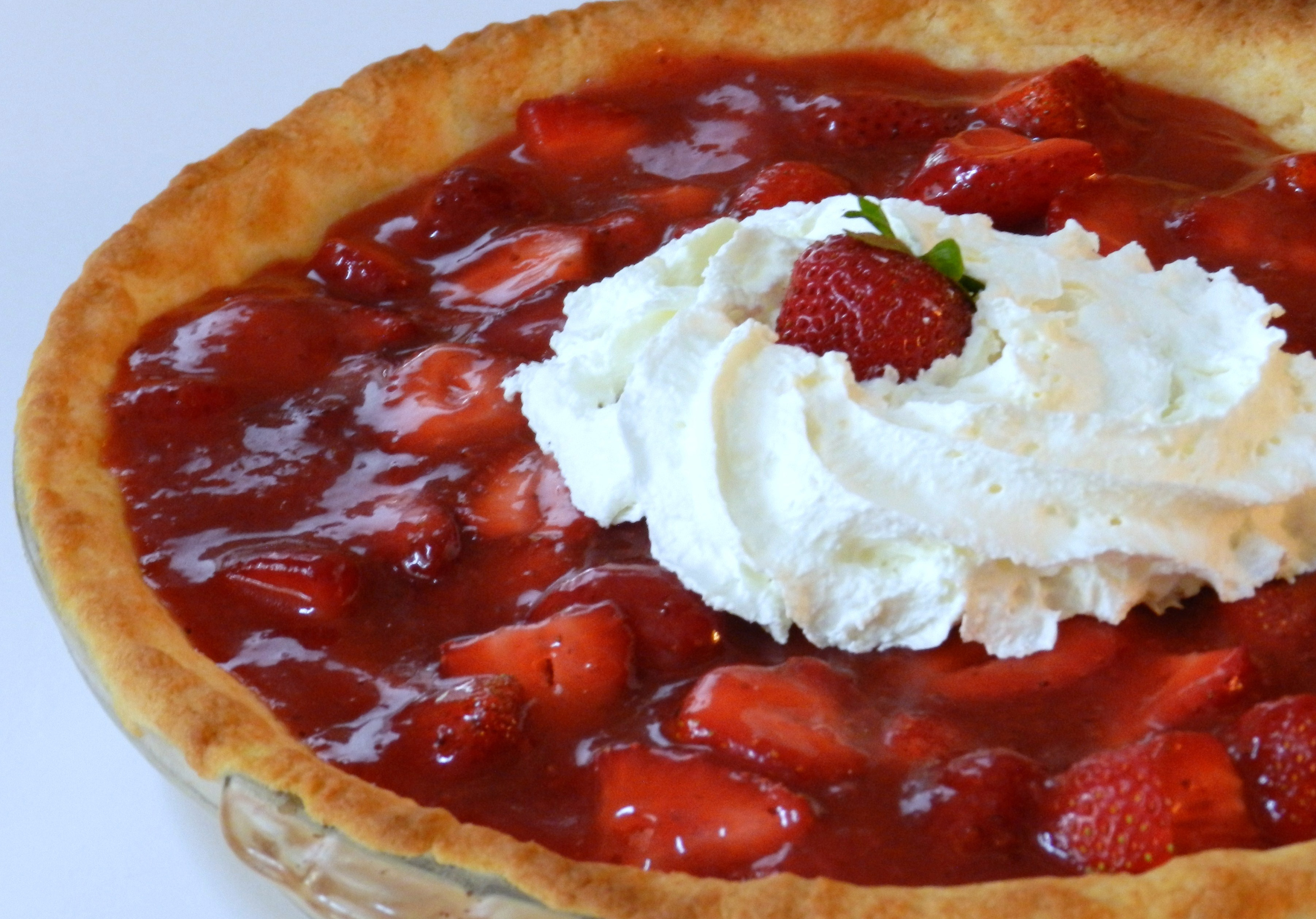Wash and drain the strawberries. Save a few pretty ones for a garnish. Remove the hulls from the rest. Crush 2 cups of the strawberries and set aside. Cut the remaining 4 cups of strawberries into halves, quarters, or slices (whatever you prefer; I just don’t like slicing into a pie with large, whole berries). In a medium saucepan, stir together the water and cornstarch. Mix well. Add the sugar and stir in the 2 cups of crushed strawberries. Bring mixture to a boil and cook until clear, about 3-5 minutes. Remove from heat. Stir in the butter. Strain the mixture using a strainer, chinois, or a clean piece of cheesecloth. Arrange the 4 cups of strawberries in the cooled pie shell. Pour the warm glaze over the strawberries. Make sure all the strawberries are covered with the glaze. Refrigerate several hours until set. Garnish with whole strawberries and fresh whipped cream. Serve. This is not a pie that ages well. It is best to make it the day you plan to eat it. It gets a little soggy and isn’t as pretty the following day. It still tastes delicious. Yes, I’ve had leftover strawberry shortcake pie for breakfast the next day! Makes 8 servings.